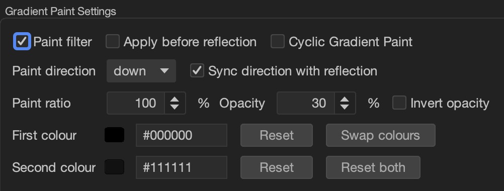 The gradient paint filter applies a linear gradient paint: if acyclic it will from the first to second colour as it moves from the first point to the second point (points dependent on the direction of the paint which can be synchronised with the reflection direction or specified specially). If cyclic it will alternate between the two colours as it moves from point A to point B (same rule applies). This is what the UI looks like to begin with: